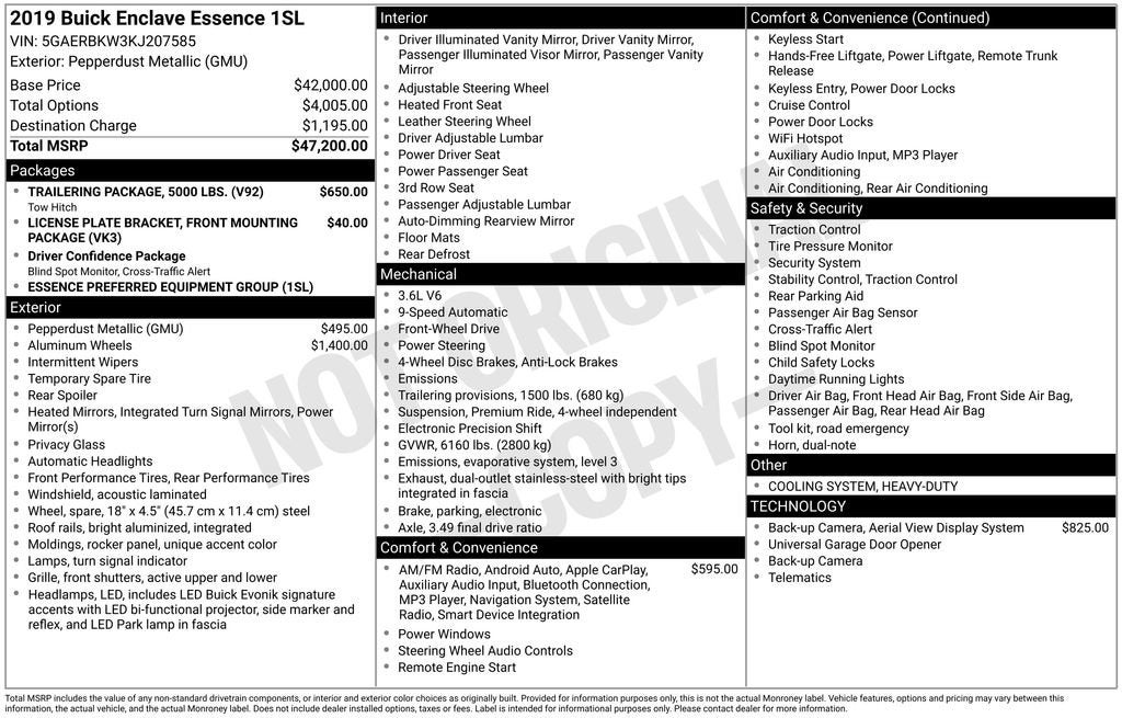 Experience the luxury and versatility of the 2019 Buick Enclave Essence. This stunning SUV boasts a sleek Gray exterior, complemented by a sophisticated Brown interior. Powered by a robust 3.6L V6 engine and equipped with a 9-Speed Automatic transmission, the Enclave Essence delivers an exceptional blend of performance and efficiency, with an impressive 18 city / 26 highway MPG rating.