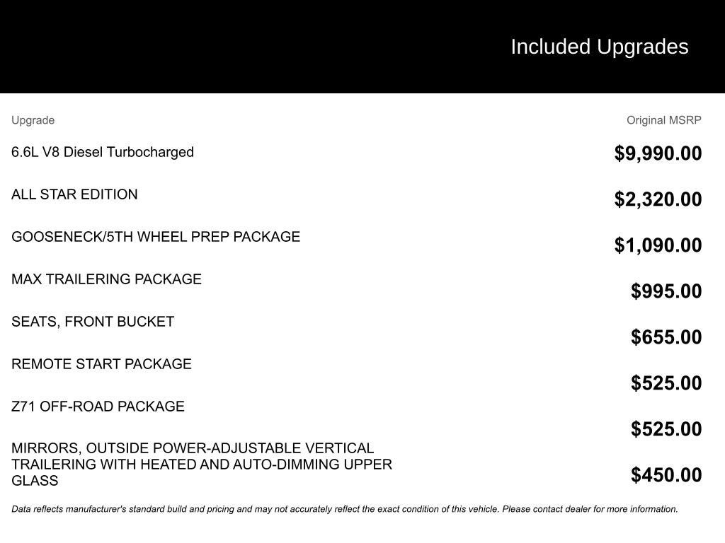 Wireless phone projection for apple carplay and android auto|wi-fi hotspot capable (terms and limitations apply. see onstar.com or dealer for details.)|bluetooth for phone connectivity to vehicle infotainment system|audio system feature, 6-speaker system (requires crew cab or double cab model.)|audio system, chevrolet infotainment 3 premium system with google built-in compatibility (select service plan required, terms and limitations apply) including navigation capability, 13.4 diagonal hd color touchscreen, includes multi-touch display, am/fm stereo, bluetooth streaming audio for music and most phones; featuring wireless apple carplay and wireless android auto capability for compatible phones, advanced voice recognition, in-vehicle apps, personalized profiles for infotainment and vehicle settings|steering wheel audio controls|mirrors, outside power-adjustable vertical trailering with heated upper glass, lower convex mirrors, integrated turn signals, manual folding/extending (extends 3.31 [84.25mm])|power outlet, bed mounted, 120-volt (400 watts shared with (ki4) interior power outlet) (standard on models built after april 7, 2025.)|mirror caps, black|bumper, rear chrome|bumper, front chrome|tire, spare lt245/75r17e all-season, blackwall (included and only available with (qhq) lt245/75r17e all-season, blackwall tires with (e63) durabed, pickup bed. available to order when (zw9) pickup bed delete and (qhq) lt245/75r17e all-season, blackwall tires are ordered.)|tailgate, gate function manual with ez lift includes power lock and release (deleted when (zw9) pickup bed delete is ordered. not available with (pcm) convenience package ii unless (qk2) multi-flex tailgate is ordered.)|taillamps with incandescent tail, stop and reverse lights|cornerstep, rear bumper|cargo tie downs (12), fixed rated at 500 lbs per corner (deleted with (zw9) pickup bed delete.)|door handles, body-color|intellibeam, automatic high beam on/off|tailgate, standard (deleted with (zw9) pickup bed delete.)|tires, lt245/75r17e all-season, blackwall|wheels, 17 (43.2 cm) machined aluminum|tailgate and bed rail protection cap, top|bedstep, black integrated on forward portion of bed on driver and passenger side (deleted when (zw9) pickup bed delete is ordered.)|lamps, cargo area, cab mounted integrated with center high mount stop lamp, with switch in bank on left side of steering wheel|tire carrier lock keyed cylinder lock that utilizes same key as ignition and door (deleted with (zw9) pickup bed delete.)|glass, deep-tinted|moldings, beltline, black|headlamps, halogen reflector with halogen daytime running lamps|keyless open and start|window, power front, passenger express down|windows, power rear, express down (not available with regular cab models.)|seat, rear 60/40 folding bench (folds up), 3-passenger (includes child seat top tether anchor) (requires crew cab or double cab model.)|seat adjuster, passenger 4-way manual|steering column, tilt-wheel, manual with wheel locking security feature|floor mats, rubberized-vinyl rear (not available with regular cab models. deleted when lpo floor liners are ordered.)|driver information center, enhanced, 12.3 diagonal reconfigurable multicolor digital display|steering wheel, wrapped|cruise control, electronic with set and resume speed, steering wheel-mounted|seats, front 40/20/40 split-bench with covered armrest storage and under-seat storage (lockable) (on crew cab and double cab models, not available with (pcm) convenience package ii unless (pcl) lt convenience package i is ordered.)|air vents, rear, heating/cooling (not available on regular cab models.)|seat adjuster, driver 4-way manual|mirror, inside rearview, manual tilt|chevrolet connected access capable (subject to terms. see onstar.com or dealer for details.)|rear seat reminder (requires crew cab or double cab model.)|cloth seat trim|air conditioning, single-zone|assist handles front a-pillar mounted for driver and passenger, rear b-pillar mounted|door locks, power|usb ports, 2, charge/data ports located on instrument panel|floor mats, rubberized vinyl, front (deleted when lpo floor liners are ordered.)|exterior temperature display located in radio display|compass located in instrument cluster|window, power front, drivers express up/down|floor covering, color-keyed carpeting|power outlet, interior, 120-volt (400 watts shared with (kc9) bed mounted power outlet) (standard on models built after april 7, 2025.)|engine, 6.6l v8 with direct injection and variable valve timing, gasoline, (401 hp [299 kw]